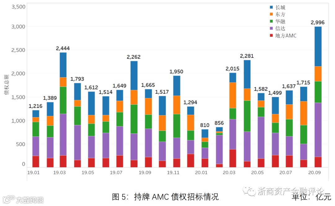 从持牌AMC招标市场的区域分布情况来看,AMC招标规模主要集中在华东和华南地区。2020年三季度AMC招标规模最大的是华东地区,约为2,389亿元,华南地区规模约为1,094亿元。