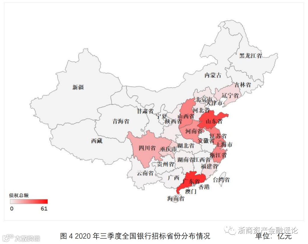 从银行招标市场的区域分布情况来看,2020年三季度银行招标规模主要集中在华东地区。华东地区的银行招标约为160亿元,其次为华南地区,约为63亿元。从银行招标市场的省份分布情况来看,广东省银行招标规模约为61亿元,山东省银行招标约为55亿元,江苏省银行招标约为38亿元。