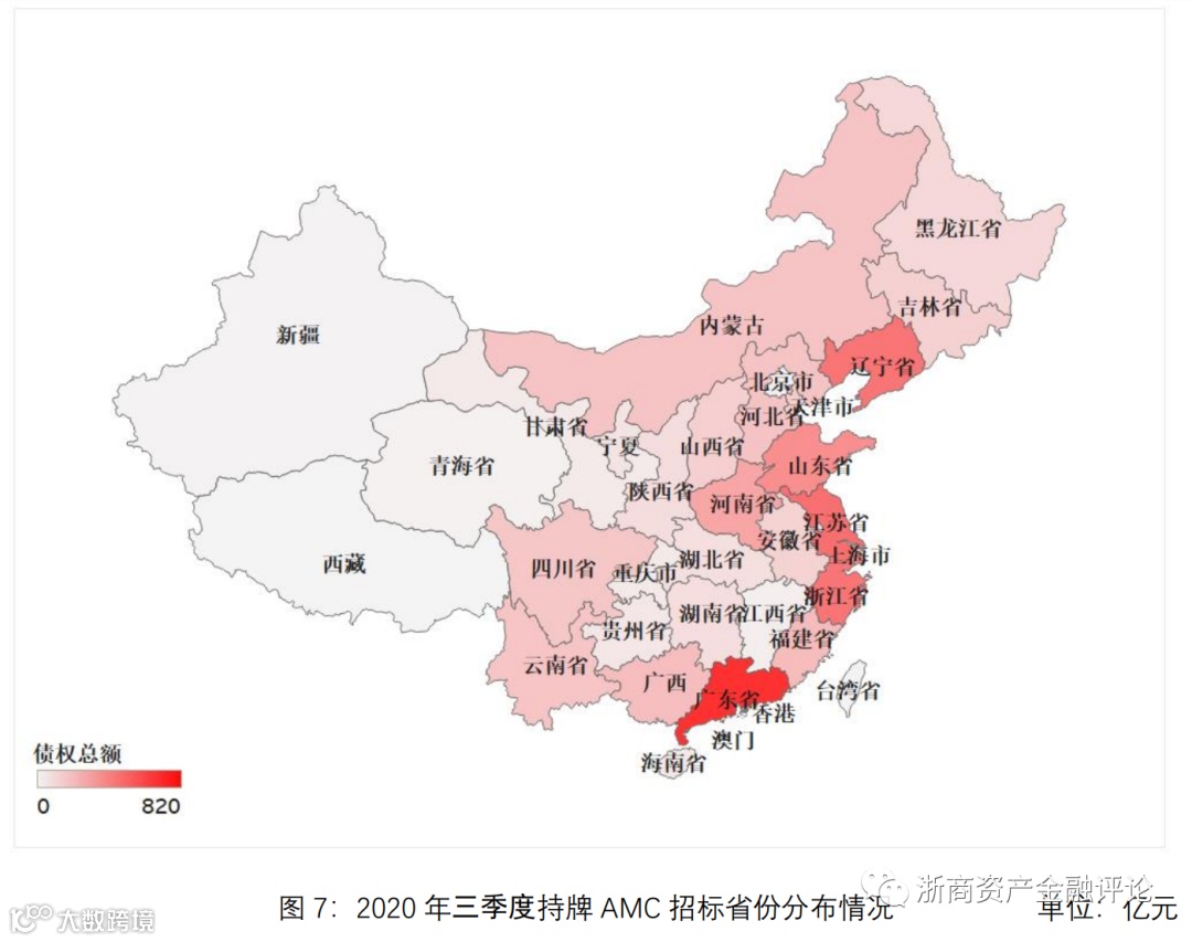从持牌AMC招标的省份分布来看,2020年三季度广东省AMC招标规模最大,约为820亿元,江苏省AMC招标规模约为570亿元,辽宁省AMC招标规模约为546亿元,浙江省AMC招标规模约为546亿元,山东省AMC招标规模约为438亿元。