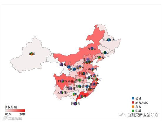 从AMC的类型来看,四大资产管理公司的业务范围基本上覆盖了全国各个省份,其中华融、长城是布局最广的;地方AMC则主要集中在华南、华东地区。