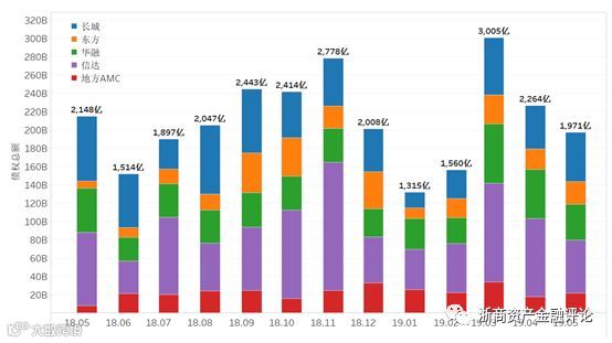 从持牌AMC的招标情况来看,2019年5月招标规模相比于2018年5月有所下降,招标规模约为1,971亿元,其中,信达招标占比29.3%,华融招标占比19.9%,长城招标占比27.3%,东方招标占比12.6%,地方AMC招标合计占比10.9%,长城、信达、华融招标规模有所下降,东方和地方AMC上升,详细的走势和占比情况如下图所示。