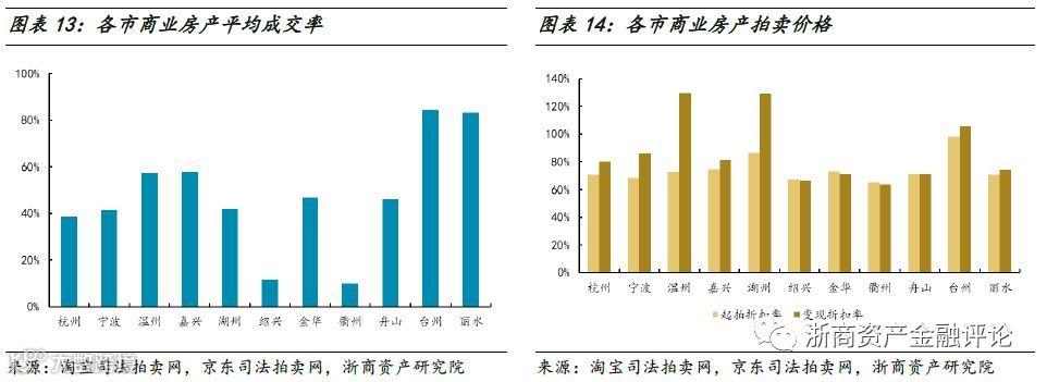 (二)商业房产:成交率和变现折扣率均有较大幅度回升;台州、丽水成交率较高,绍兴、衢州成交率较低,金华、衢州变现与起拍价出现倒挂