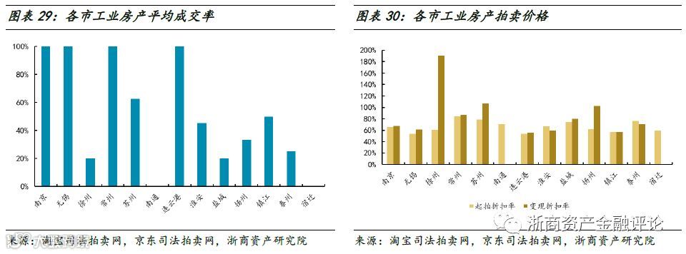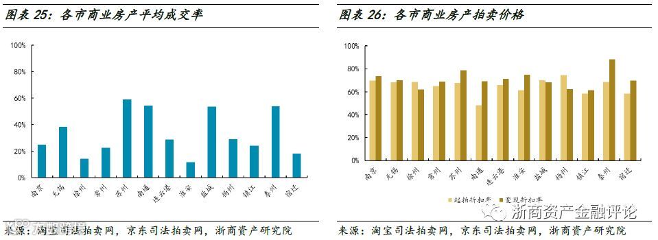 (二)商业房产:成交率、变现折扣率大幅回升;苏州、南通、盐城、泰州成交率较高,徐州、盐城、扬州变现与起拍价差出现倒挂