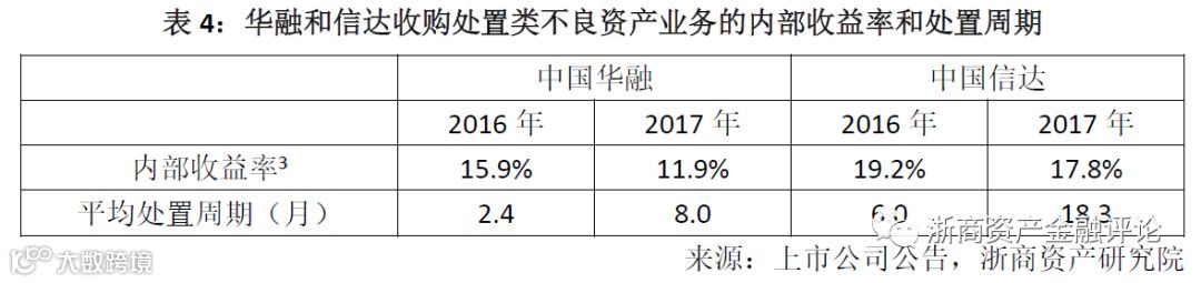 那么,导致华融和信达收购处置类不良资产业务净收益率差异的原因又是什么呢?表4列出了华融和信达收购处置类不良资产业务2016年和2017年的内部收益率以及根据净收益率、内部收益率得出的平均处置周期。可以看到,2016年和2017年信达收购处置类不良资产业务的内部收益率和平均处置周期都远大于华融,其中信达的平均处置周期是华融的2倍多,这与华融资产周转率高于信达相符。因此,内部收益率和平均处置周期的差异均是导致信达和华融净收益率差异的因素。内部收益率更高表示平均各单不良资产处置业务的真实盈利能力更强,而平均处置周期的不同则只是不同公司的不良资产处置策略不同,但由于在计算两家企业同一时期内不良资产处置业务的净收益率时,考虑的是收购成本,而不是资金成本,所以即使两家企业该业务的内部收益率相同,平均处置周期较长的那家企业该业务的净收益率会更大(详细分析见附录)。