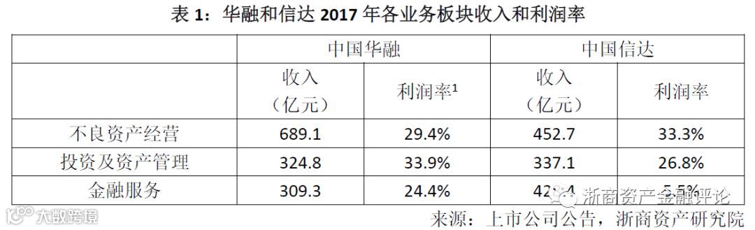 根据华融和信达披露的财务报告,这两家企业除了不良资产经营业务以外,还开展了投资及资产管理业务和金融服务业务,如表1所示,由于不同类型业务属性不同,分部财务指标的数值往往各异,它们对整体财务指标数值的影响程度也不相同,因此,企业整体的财务指标并不是衡量不良资产处置业务盈利能力的合适指标。同样的,华融和信达的不良资产经营业务还分为收购处置类和收购重组类,也都应该分别进行比较。