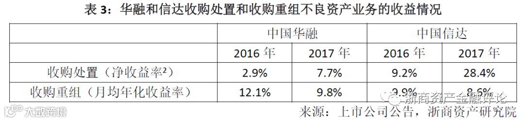 因为华融和信达不良资产经营业务又分为收购处置和收购重组两种类型,我们分别来看这两种类型不良资产经营业务的收益情况。如表3所示,信达收购重组类业务的月均年化收益率要略低于华融,但是收购处置类业务的净收益率要远高于华融,因此,信达不良资产经营业务利润率比华融高,在很大程度上是因为其收购处置类不良资产业务的净收益率远高于华融导致的。