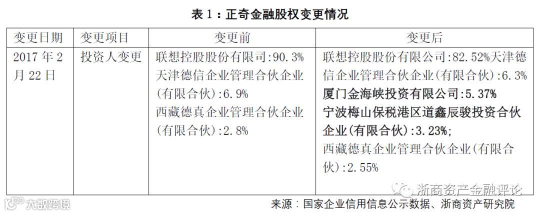 正奇金融于2012年10月成立,注册地安徽,注册资本27.9亿元,由联想控股绝对控股,是一家专为中小企业提供融资服务的金融控股公司。正奇金融依托联想控股的强大股东背景,发挥资金及产业整合等先天优势,通过收购和发起设立等方式,不断完善扩充类金融板块,打造“类金融超市”。公司下设的主要业务板块包括小额贷款、融资担保、典当、融资租赁、商业保理、供应链管理、权益类投资、资产管理、资本市场业务和互联网金融。目前,旗下子公司数量13家,分别设立于安徽、北京、上海、深圳、武汉等地,在京津地区、珠三角、长三角、长江经济带四大重要板块进行了战略布局,业务范围覆盖全国。