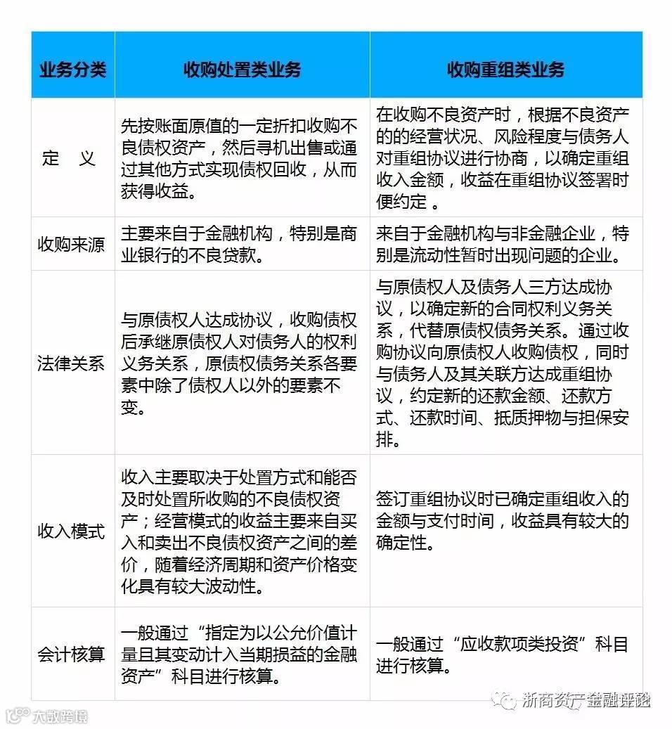 要了解这两个科目,先得从资产管理公司不良债权资产经营业务类型说起。按照经营模式分类,资产管理公司不良债权资产经营业务分为收购处置类业务和收购重组类业务,两者在收购来源、法律关系和收入模式、会计核算方面存在诸多不同,主要区别如下表: