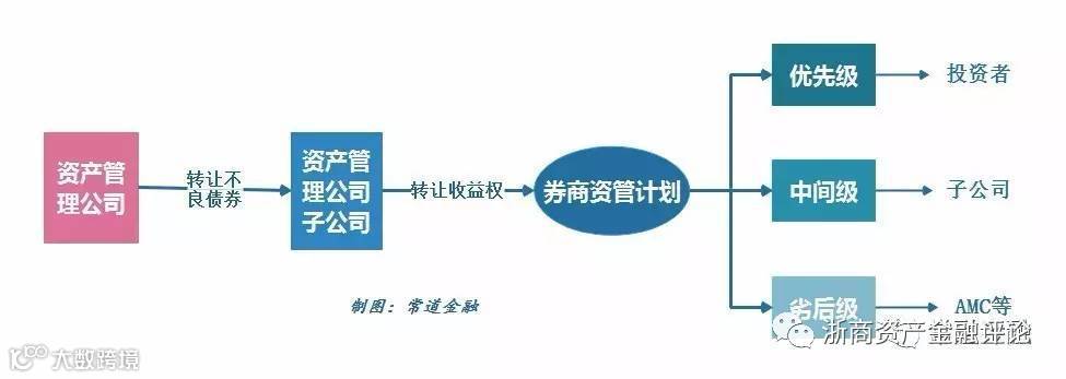 该业务模式通常为,资产管理公司将不良债权出售给子公司,子公司设立以该不良债权受益权为标的的资管计划,并对资管计划份额进行分级(一般分为优先级、中间级、劣后级),分别由资产管理公司、子公司和外部投资者共同出资购买,分级结构的设计主要是向外部投资者提供信用增级。