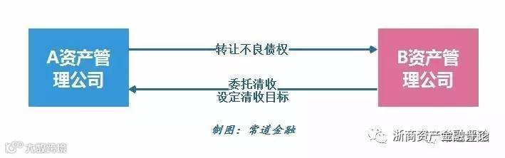 在该模式中,假设有A、B两家资产管理公司,B资产管理公司受让A资产管理公司的应收款项类债权,同时与A公司签署委托清收协议,约定清收期限和清收目标。B公司分期支付收购款,而且支付时间可能会与A公司支付清收收入的时间及金额相近,或者在A公司支付B公司清收收入后B公司再支付收购款。