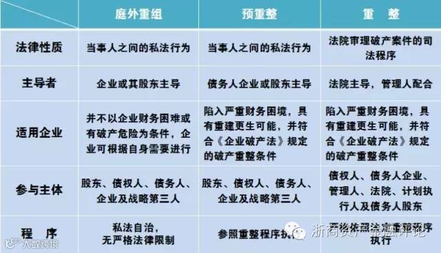 相比于庭外重组,即通常意义上的以业务重组、资产重组、债务重组、股权重组为特色的重组方式,预重整将重整程序与庭外重组相结合,升华了庭外重组,使其进可与重整程序相接续,退可通过庭外重组即完成企业自我拯救。
