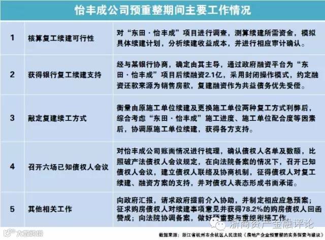 杭州怡丰成房地产开发有限公司(下称怡丰成公司)因资金链问题,其开发的“东田·怡丰城”项目自2015年3月以来即处于停工状态,因诉讼缠身,楼盘及监管账户也均被查封。后怡丰成公司向杭州市余杭区人民法院申请破产重整,但因“东田·怡丰城”项目涉及复工续建、购房债权人、工程债权人等诸多利益关系,法院在破产预登记后,即建议公司自行预重整。