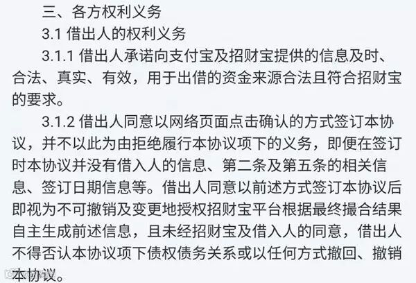 不过,澎湃新闻注意到,该合同在“各方权利—出借人权利义务”中写道:“借出人同意以网络页面点击确认的方式签订本协议,并不以此为由拒绝履行本协议项下的义务,即便在签订时本协议并没有借入人的信息、第二条及第五条的相关信息、签订日期信息等。”无独有偶,在招财宝官网公布的中小企业贷借款合同中,也同样出现了这句话。