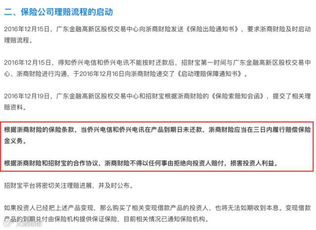 目前,对本次逾期的私募债本息提供保证保险的浙商保险已启动理赔流程。不过,浙商财险表示广东股交中心的索赔资料尚不完整,正在通知其尽快补全。但总之,投资者还没有拿到钱。