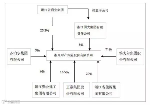 浙商保险是一家国有控股保险公司,国有比例占比53.5%,公司实际控制人为浙商集团,实际持股比例为33.5%。另外还有雅戈尔集团股份有限公司、浙江省能源集团有限公司、正泰集团股份有限公司、浙江国大集团有限责任公司、浙江勤业建工集团有限公司和苏泊尔集团有限公司进行持股,持股比例分别为21%、20%、16.5% 、8%、6%和3%。
