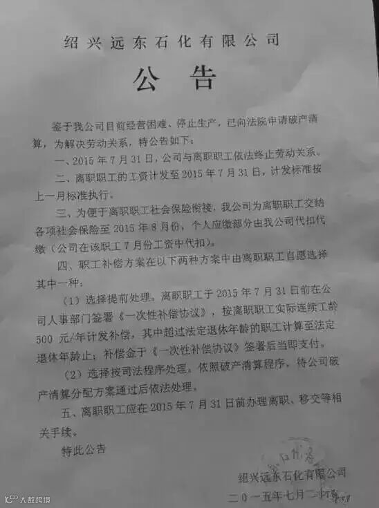 这则公告的出示,意味着远东石化已经启动破产程序。