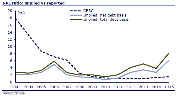 法国里昂证券(CLSA)认为中国银行的坏账率可能高达8.1%,是官方数字1.5%的六倍之多,这意味着7.5万亿元人民币的资本缺口,超过中国GDP的十分之一。