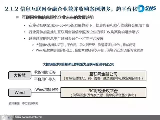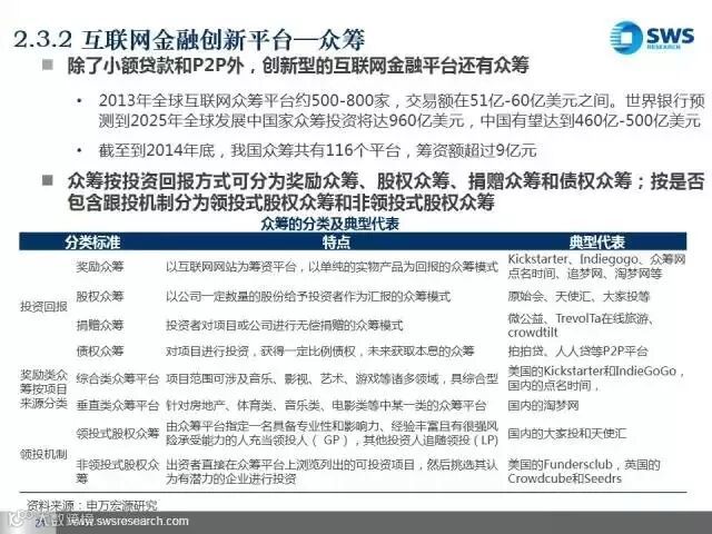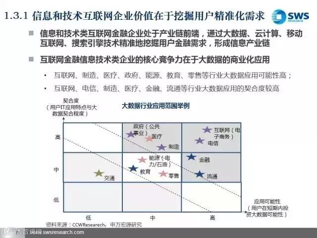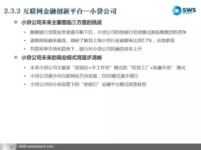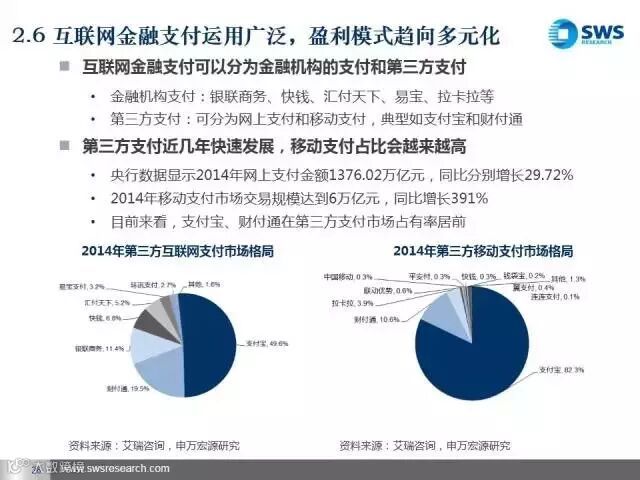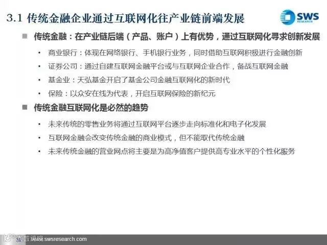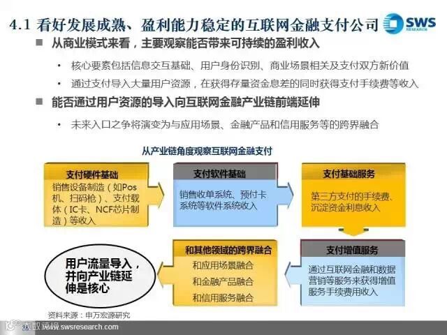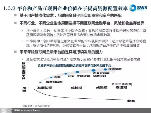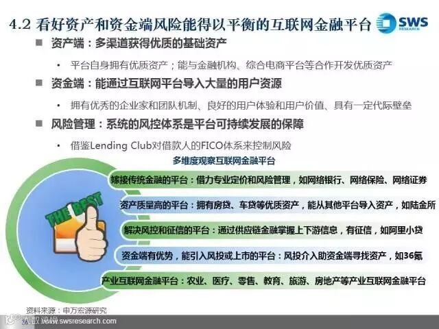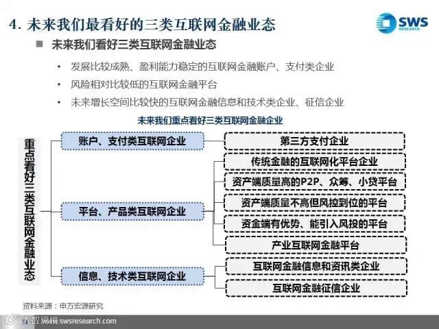 未来我们最看好三类互联网金融平台。第一类是发展比较成熟、盈利能力稳定的互联网金融账户、支付类企业,主要看其导入用户流量和向产业链前端延伸的能力;第二类是资产和资金端风险能匹配的互联网金融平台和产业互联网金融平台,主要看其获得优质资产和风险控制的能力;第三类是互联网金融信息技术类企业,包括大数据分析和征信类企业,主要看其将大数据商业化应用的能力。