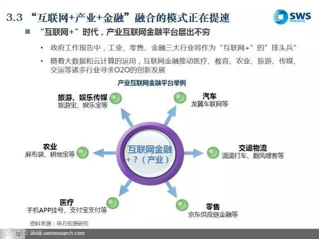 互联网金融从点对点到点对面进行跨界融合。点对点是指在传统金融机构和互联网企业的跨界融合,主要表现为传统金融机构通过互联网化向产业链前端延伸和互联网企业通过金融化向产业链的后端延伸。而点对面的跨界融合则表现为产业+互联网+金融的“1+1+1”的跨界融合模式日益盛行,医疗、汽车、教育、旅游、农业、物流等行业纷纷拥抱互联网金融,正改变着传统企业的商业模式。