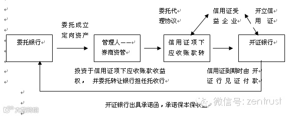 (1)由资金委托银行以理财资金委托券商资管成立定向资产管理计划;(2)券商资管作为定向资产管理计划的管理人将委托资产投资于应收账款转让银行的信用证项下应收账款收益权;(3)信用证到期后,由开证行对信用证进行到期兑付,到期兑付资金由转让银行托收后返还定向计划,再通过定向计划返还委托银行;(4)委托银行通常要求开证行以保函方式或者定向计划收益权远期转让的方式对信用证进行兜底。