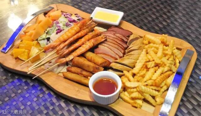 店家为品酒打造的拼盘,由烤虾、鸭胸肉、薯条、德国香肠、蔬果沙律和春卷组成,完全符合下酒菜的要求,而且足足有4到5个人的分量,三五知己的聚会,一盘搞定。
