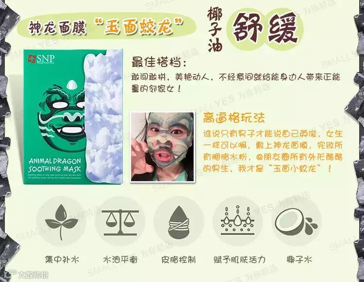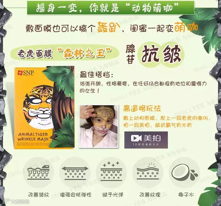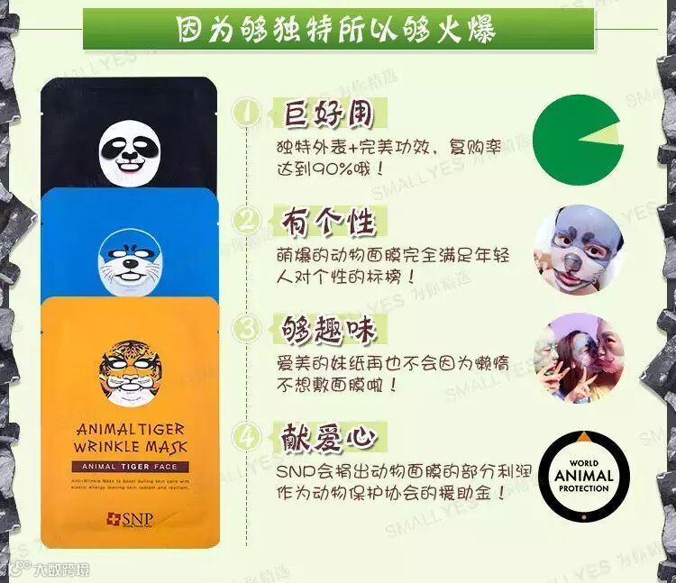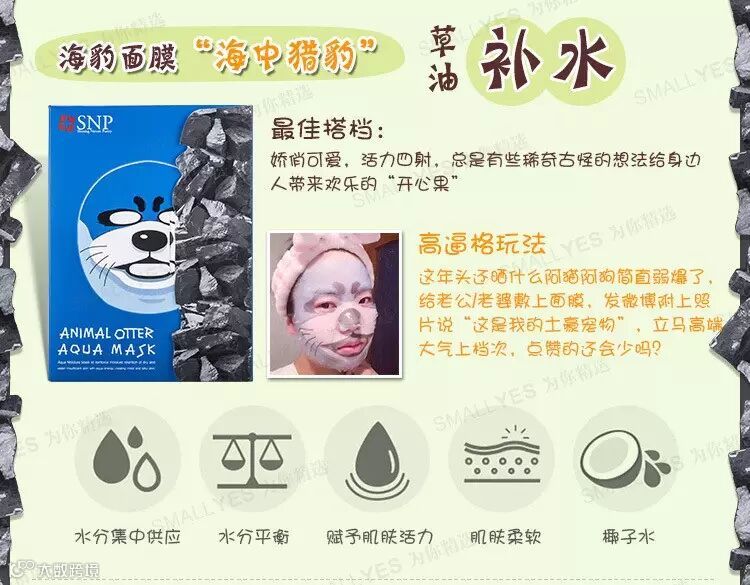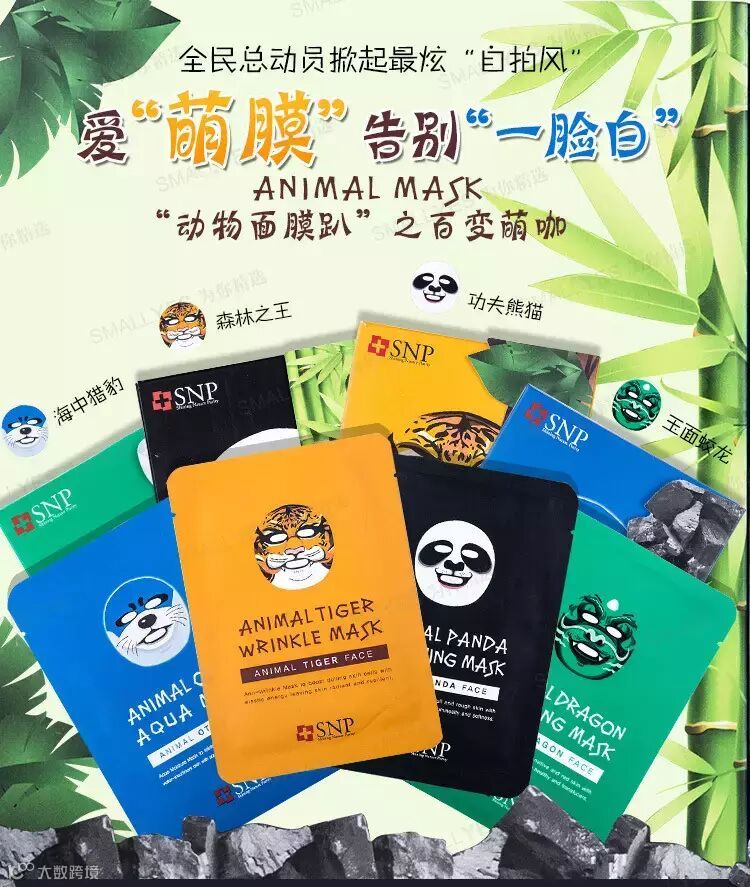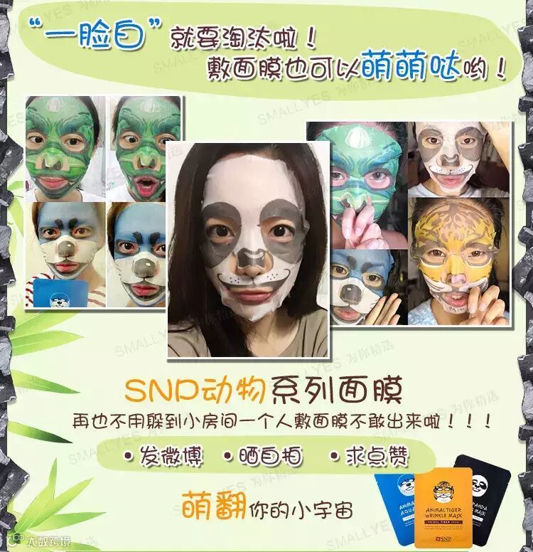 SNP动物面膜系列是很多韩国顶级明星们公认的肌肤护理秘诀,这款产品以椰汁成分为基础,对敏感肌肤不会产生任何刺激,独特的印刷效果使护肤更具乐趣!不少情侣会在旅行地使用动物面膜,并拍照传到网上,虐死单身狗的节奏啊。
