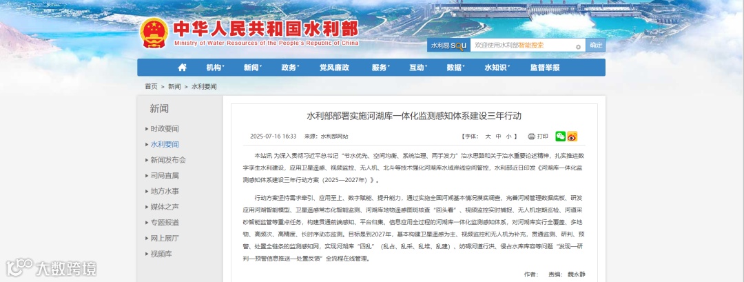 7月中旬,水利部正式印发《河湖库一体化监测感知体系建设三年行动方案(2025—2027年)》,标志着我国智慧水利建设进入新一轮提速阶段。该方案聚焦构建覆盖“感知—归集—应用”全流程的监测体系,提出以卫星遥感、视频监控、无人机、北斗等现代化技术装备为支撑,在三年内推动河湖库监管能力从“数字化建模”迈向“智能化预警”。