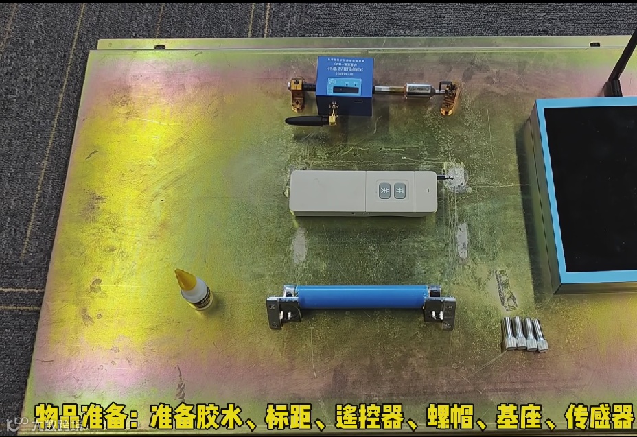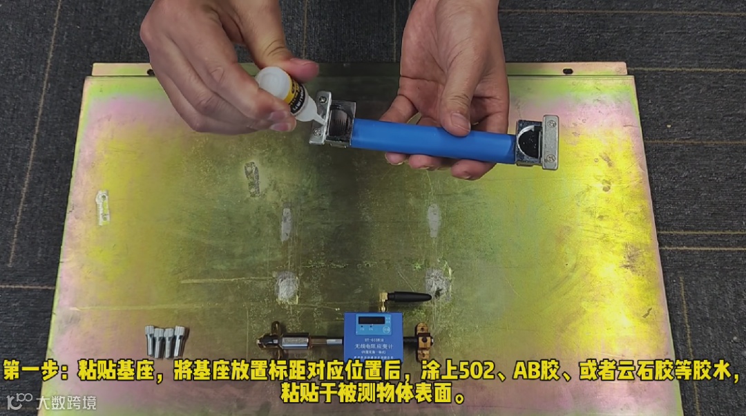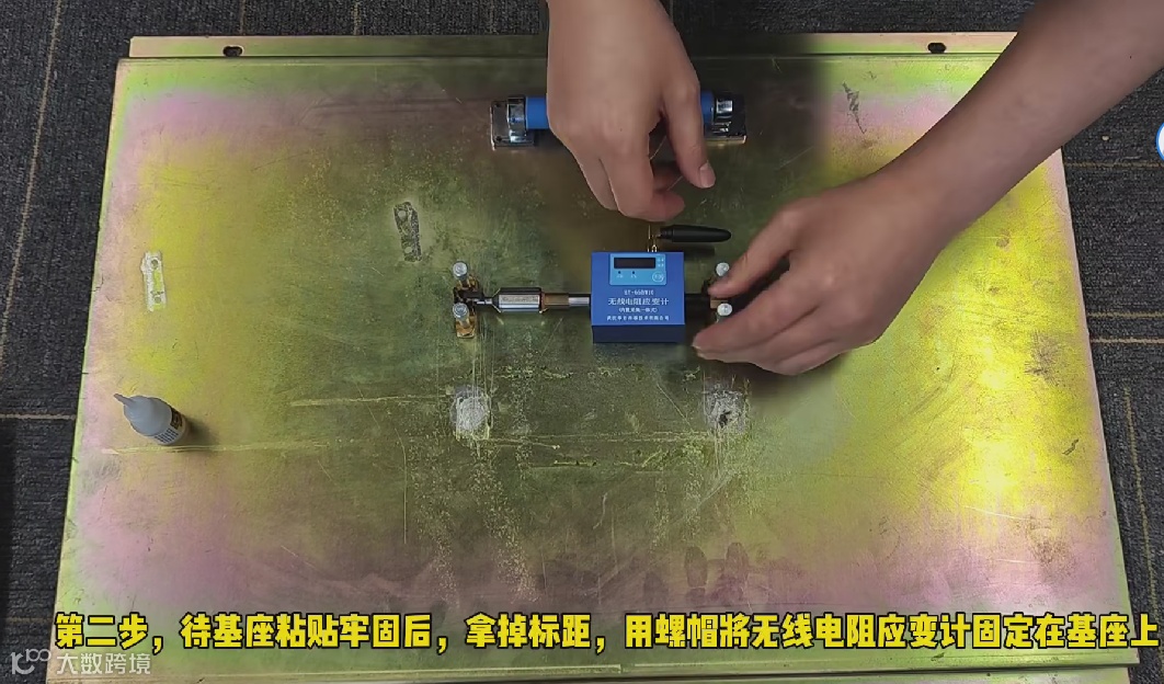 等待片刻后,取下标距模板,基座粘牢后放上应变计用4个螺丝拧紧。