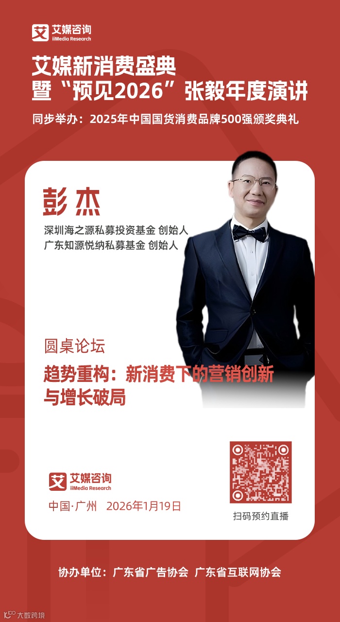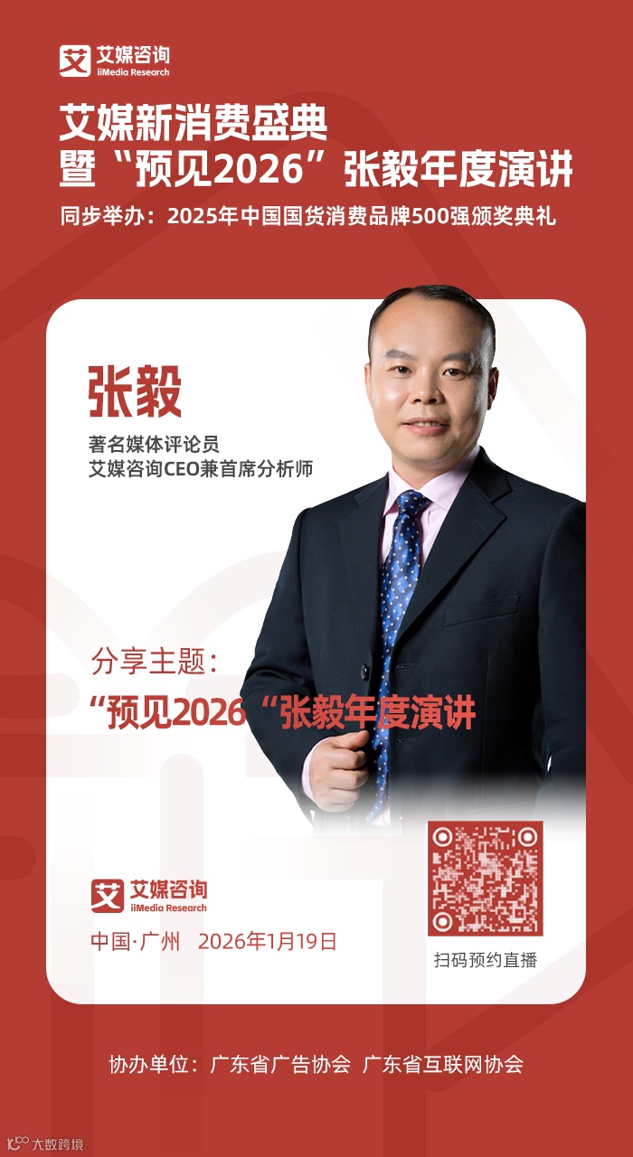 由全球新经济产业第三方数据挖掘与分析机构iiMedia Research (艾媒咨询) 主办的艾媒新消费盛典暨“预见2026”张毅年度演讲,将于2026年1月19日14:30重磅开播!这不仅仅是一场盛典,更是一场汇聚行业智慧、洞悉未来商业格局的年度思想盛宴。