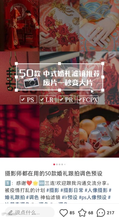 比如,有个博主分享了“摄影师都在用的50款婚礼跟拍调色预设”,里面分了白婚纱预设、红礼服预设、合影预设。