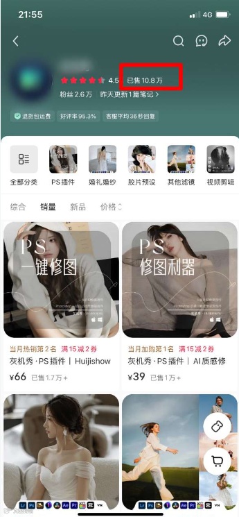 他做的是PS修图插件,目前,这个店铺,已经卖了10.8万份了,我大概算了一下,他已经挣了356W。