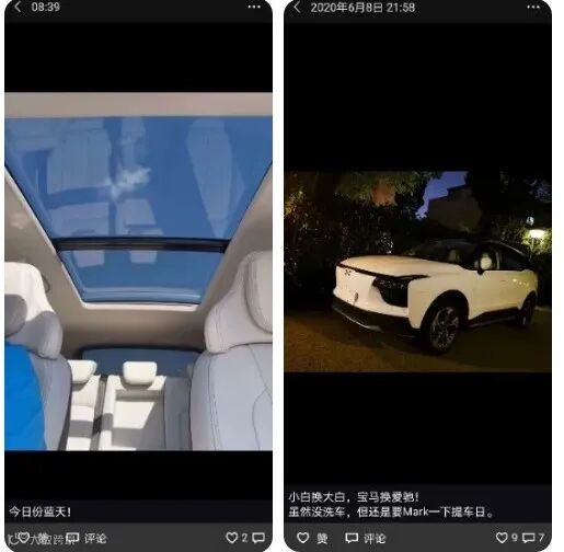 上一台是白色宝马轿车,这次换爱驰也选择了白色。从小白到大白,空间上宽敞了不少,收纳压力减轻许多,家人满意度都比较高。我个人是很喜欢车顶的大天窗,坐进车里,感觉舒适又宽敞,长途开车也不会闷。后排座椅还能放平,平时休息也比较方便,很实用。