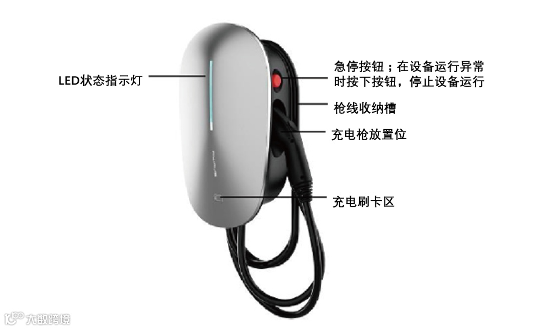 爱驰充电桩分为壁挂式充电桩和落地式充电桩两种,外部由LED状态指示灯,急停按钮,充电刷卡区,充电枪放置位,枪线收纳槽等组成。