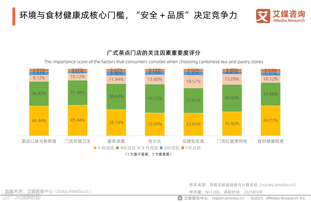 iiMedia Research(艾媒咨询)数据显示,消费者选择广式茶点门店时,最看重门店环境卫生,5分评价占比45.44%;食材健康程度紧随其后,5分占比44.77%。艾媒咨询分析师表示,这一结果直观反映了当下消费者对餐饮消费的核心诉求——“安全”与“品质”已成为基础门槛,干净整洁的就餐环境是建立消费信任的第一步,而口味与新鲜度则直接决定了门店的核心竞争力与复购率。
