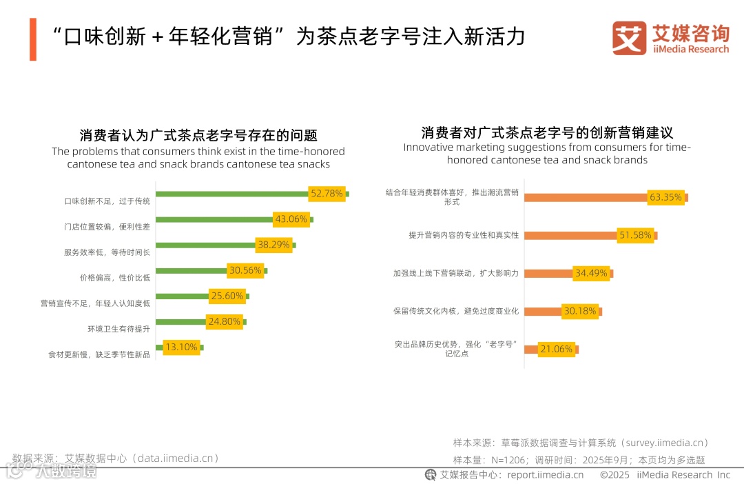 iiMedia Research(艾媒咨询)数据显示,52.78%消费者认为茶点老字号最大问题是口味创新不足、过于传统;此外,认为其“营销宣传不足,年轻人认知度偏低” 的也占比不少。在创新营销上,63.35% 消费者建议,应结合年轻群体喜好推出潮流形式。艾媒咨询分析师认为,茶点老字号需双管齐下破局,既要保留传统风味推进口味创新,也要通过年轻化营销提升认知度,才能更好适应市场需求。