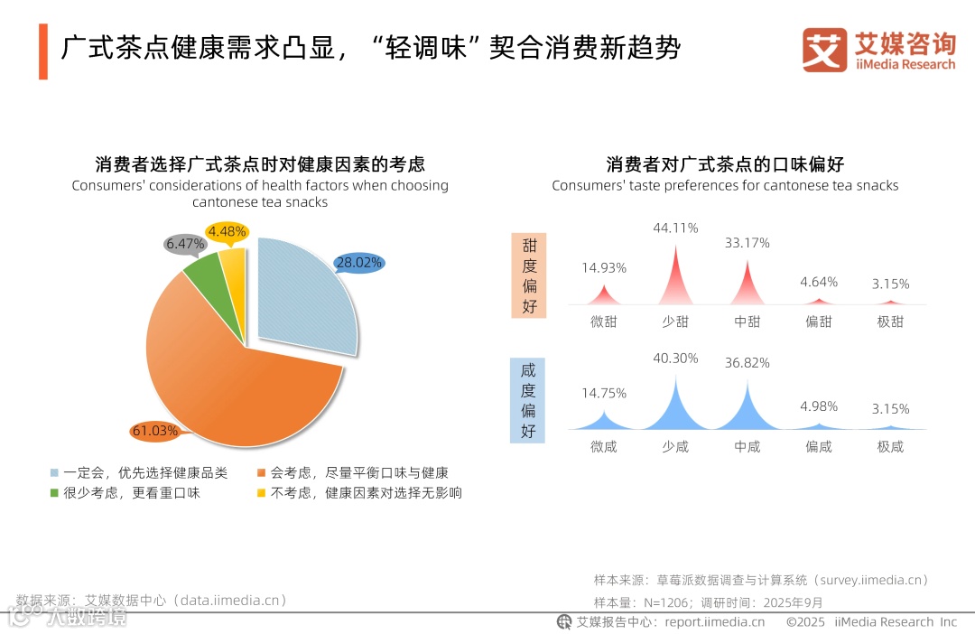 iiMedia Research(艾媒咨询)数据显示,近90%消费者会因健康因素(如低脂、低糖、少盐)特意选择广式茶点品类;少甜、少咸为消费主流选择,两者占比均超40%。艾媒咨询分析师认为,健康已成为消费者选茶点的核心决策因素,大众需求从风味优先逐渐转向风味与健康兼顾;同时轻调味茶点更契合当下趋势,商家可通过优化配方(如减糖盐)、明确标注健康属性,贴合需求并提升竞争力。