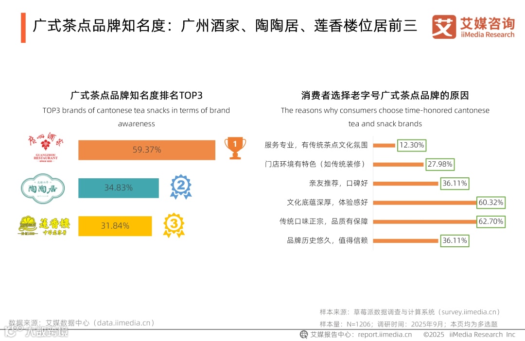 iiMedia Research(艾媒咨询)数据显示,广式茶点品牌知名度TOP3为广州酒家、陶陶居、莲香楼;消费者选择这些老字号品牌的核心原因集中在两类,一是“传统口味正宗、品质有保障”,二是“文化底蕴深厚、体验感好”,且两项占比均超60%。艾媒咨询分析师认为,老字号广式茶点的核心竞争力呈多维度,“口味 + 品牌”满足“品质安全”需求,“文化 + 体验”契合情感升级需求,其“传统基因”既是连接消费者需求的关键,也为品牌构建了差异化优势。