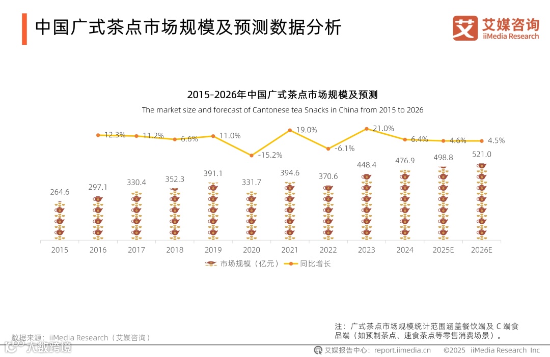 iiMedia Research(艾媒咨询)数据显示,2024年中国广式茶点市场规模达到476.9亿元,同比增长6.4%;预计到2026年有望达到521.0亿元。消费需求多元化推动品类创新、品牌化发展提升市场集中度、渠道拓展打破时空限制等因素,共同支撑着广式茶点市场进一步扩容。
