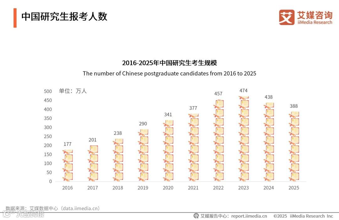 数据显示,2016-2023年中国研究生考生人数逐年攀升,2024年报考人数首次出现下滑态势,2025年硕士研究生招生考试报名人数为388万,比2023年减少50万。艾媒咨询分析师认为,报考规模连续两年回落,反映了就业市场的形势变化,学历不再是决定就业的绝对因素,考生报考趋于理性,部分年轻人选择就业或考公从而分流了考研人数。