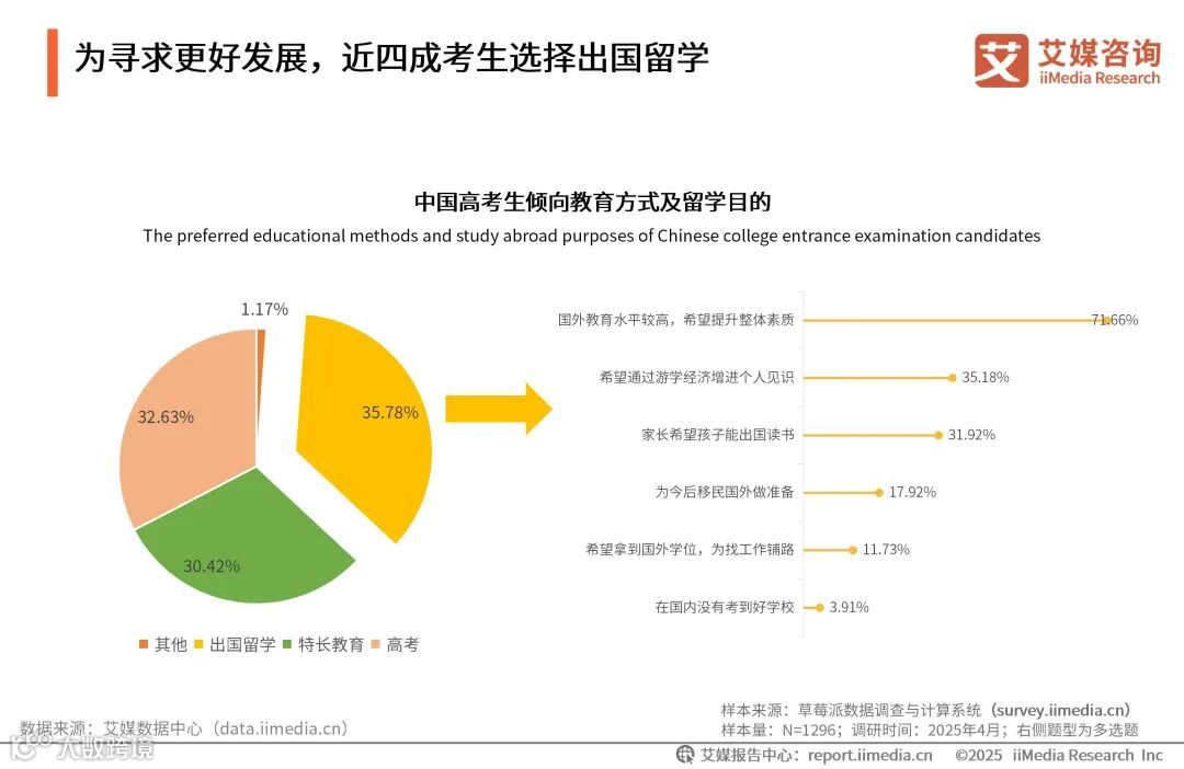 iiMedia Research(艾媒咨询)数据显示,35.78%的高考生希望出国留学,前三因素分别是国外教育水平高(71.66%)、通过游学增进见识(35.18%)、家长希望孩子能出国读书(31.92%)。艾媒咨询分析师认为,随着居民生活水平提高,部分考生选择出国留学,获得国际化的视野,以期未来能有更好的发展。