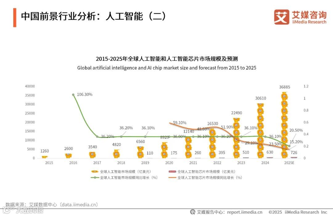 数据显示,全球人工智能市场规模和人工智能芯片市场规模均呈现显著的增长趋势。2015年,全球人工智能市场规模为1260亿美元,预计到2025年,全球人工智能市场规模将达到36885亿美元。2019年全球人工智能芯片市场规模仅110亿美元,2025年预计将增长至726亿美元。艾媒咨询分析师认为,全球人工智能市场规模及芯片领域的高速增长凸显中国在AI领域的战略发展潜力,技术突破与产业链升级将驱动人才需求激增,促使高考生及家长更倾向选择人工智能、芯片研发等前沿学科,以适配未来产业变革需求。