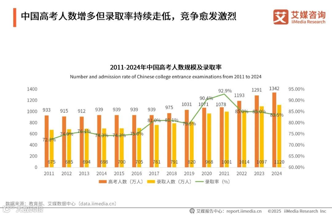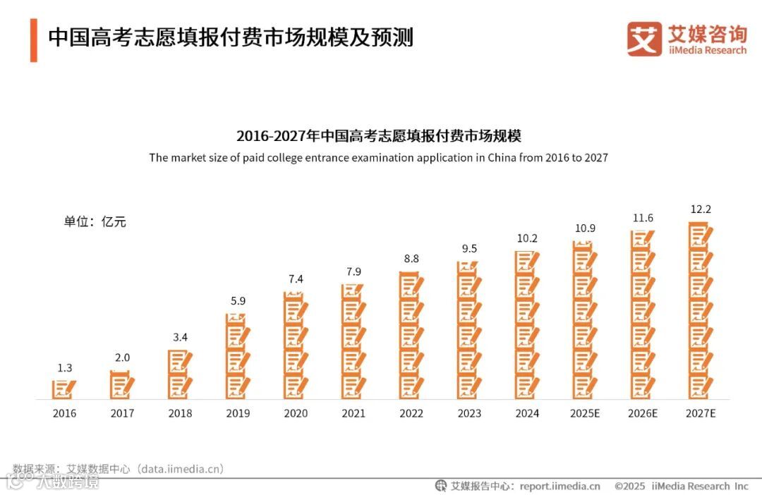iiMedia Research(艾媒咨询)数据显示,超九成高考生愿意选择高考志愿填报服务,2025年中国高考志愿填报市场付费规模预计为10.9亿元。目前,由于高考生缺乏获取高考填报信息的渠道,加上高考录取人数逐年递增,高考志愿报考行业付费需求增多,预计2027年将增至12.2亿元。