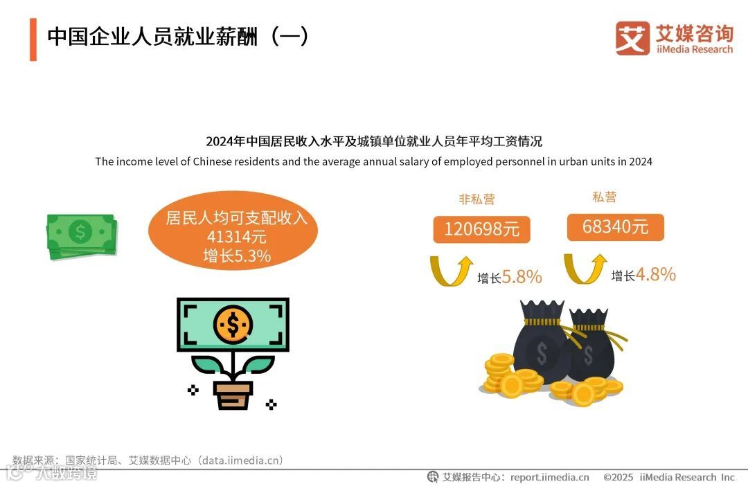 数据显示,2024年城镇私营单位就业人员年平均工资为68340元,同比名义增长4.8%;城镇非私营单位就业人员年平均工资为120698元,同比名义增长5.8%。非私营单位工资水平与增速均高于私营单位。艾媒咨询分析师认为,中国企业人员就业薪酬呈现结构性差异,非私营单位薪酬显著高于私营单位,反映出企业性质、行业资源等因素对薪酬的影响。整体来看,居民收入与就业工资虽有增长,但不同单位间差距明显。