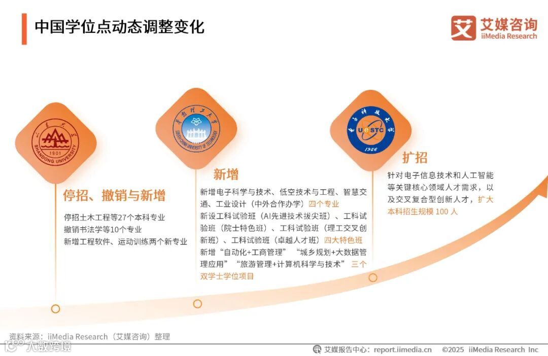 2023年3月,教育部等五部门印发《普通高等教育学科专业设置调整优化改革方案》,提出到2025年,优化调整高校20%左右学科专业布点,新设一批适应新技术、新产业、新业态、新模式的学科专业,淘汰不适应经济社会发展的学科专业。2024年已完成专业调整新增1673个、撤销1670个。已有一批高校据此完成了2025年的调整计划。