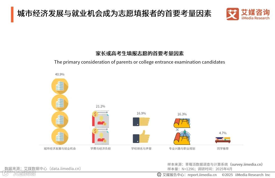 iiMedia Research(艾媒咨询)数据显示,40.9%的家长或高考生认为填报志愿的首要考量因素为城市经济发展与就业机会,反映出家长与考生对职业起点及发展潜力的高度关注。城市经济水平直接关联产业资源聚集度与岗位适配性,优先选择经济发达、就业机会多的城市,既能积累实践经验,又能提前建立职业人脉,为未来长期发展创造有利条件。