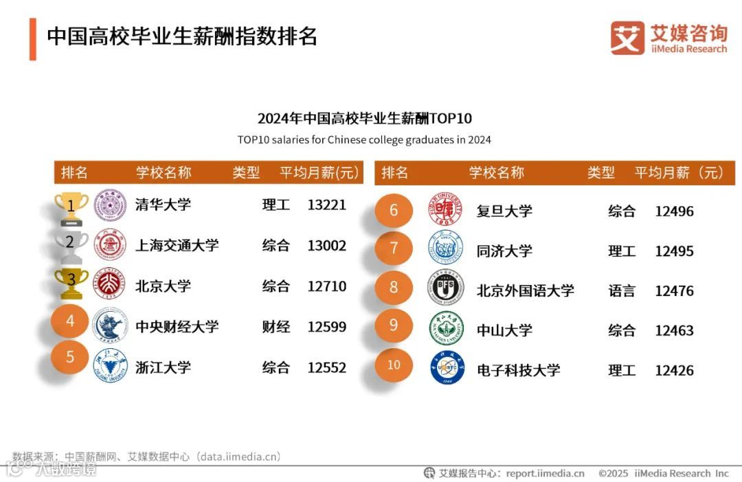 数据显示,2024年中国高校毕业生平均月薪最高的为清华大学,达13221元,其次是上海交通大学、北京大学、中央财经大学、浙江大学。前十高校名校效应显著,平均月薪均超1.2万元,且多为理工或综合类院校,反映市场对相关专业人才的高需求与高薪酬。