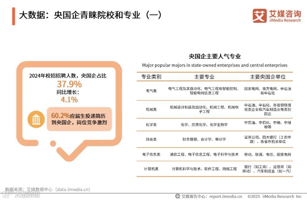 近年来,国资委积极推动中央企业吸纳高校毕业生就业,取得积极成效。2024年,央国企校招岗位数量同比增长约4.1%。国家电网、中石油、中石化等传统能源央企招聘量稳定,中国移动、中国电信等通信企业因 5G 建设加速扩招 15%。国家电投、中国商飞等企业硕士及以上学历占比超 50%,核心研发岗普遍要求博士。