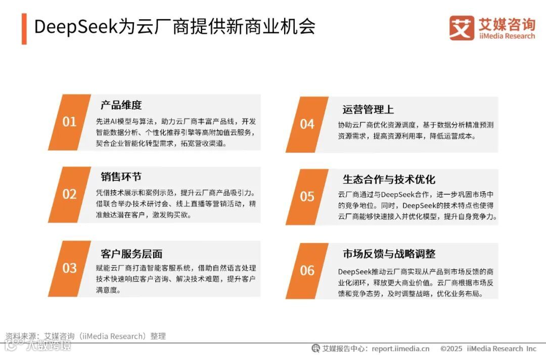 DeepSeek通过其开源性和低算力需求,为云厂商提供了新的商业模式和盈利机会,推动了云厂商的商业化闭环。云厂商通过优化算力资源、提供MaaS服务、布局市场、与垂直行业深度融合,以及生态合作和技术优化,实现了业务增长和市场竞争力的提升。