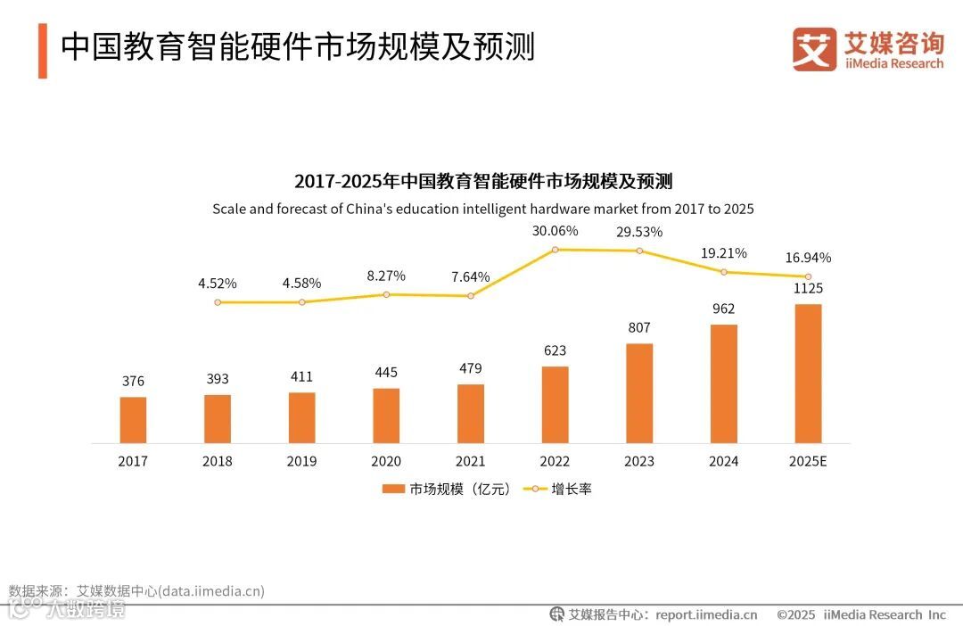 iiMedia Research(艾媒咨询)数据显示,2017-2024年中国教育智能硬件市场规模整体呈现上升趋势,2024年中国教育智能硬件市场规模达962亿元,同比增长19.21%。2022年开始中国教育智能硬件市场规模增长率大幅度飙升。艾媒咨询分析师认为,受“双减”政策的影响,大部分线下教育辅导机构由线下教育变为线上教育,教育智能硬件设备成为传统校外辅导的重要替代方案。