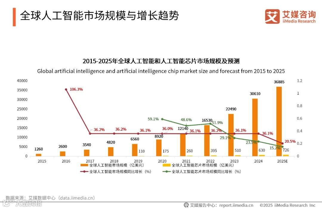 2025年中国人工智能市场正迎来发展新机遇。随着“DeepSeek”的发布,重新改变了市场对开源大模型的认知。Deepseek的快速发展正在深刻影响着各行各业的未来发展,推动各行业向智能化、数字化方向加速转型。全球新经济产业第三方数据挖掘和分析机构iiMedia Research(艾媒咨询)最新发布的《2025-2026年Deepseek撬动产业链的商业机会及布局策略报告》数据显示全球人工智能市场规模和人工智能芯片市场规模均呈现显著的增长趋势。预计到2025年,全球人工智能市场规模将达到36885亿美元。